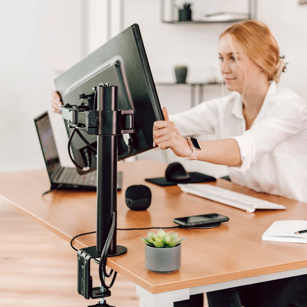 The right chair and desk provide the conditions for a more ergonomic working environment. Not to forget a monitor arm that allows you to have your computer at the right height. It promotes back-friendly working and an ergonomic posture. Improve your user potential with Hama's monitor arm.
