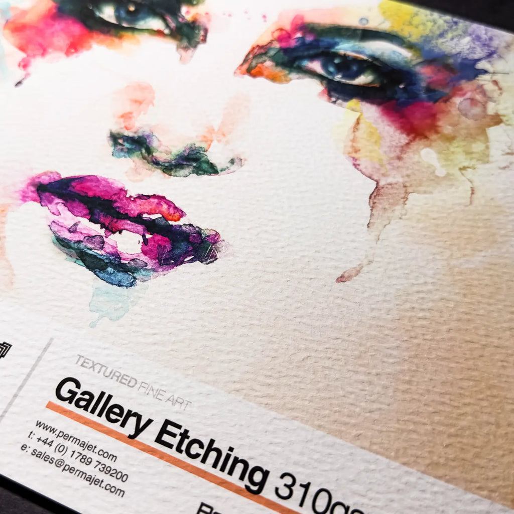 The PermaJet Gallery Etching 310 is a premium 310gsm Alpha Cellulose fine art inkjet paper with a heavily textured matt surface and a natural white base. Its pronounced, random undulations give every print a unique, lifelike quality, making it a favourite for artists, illustrators, and fine art photographers.